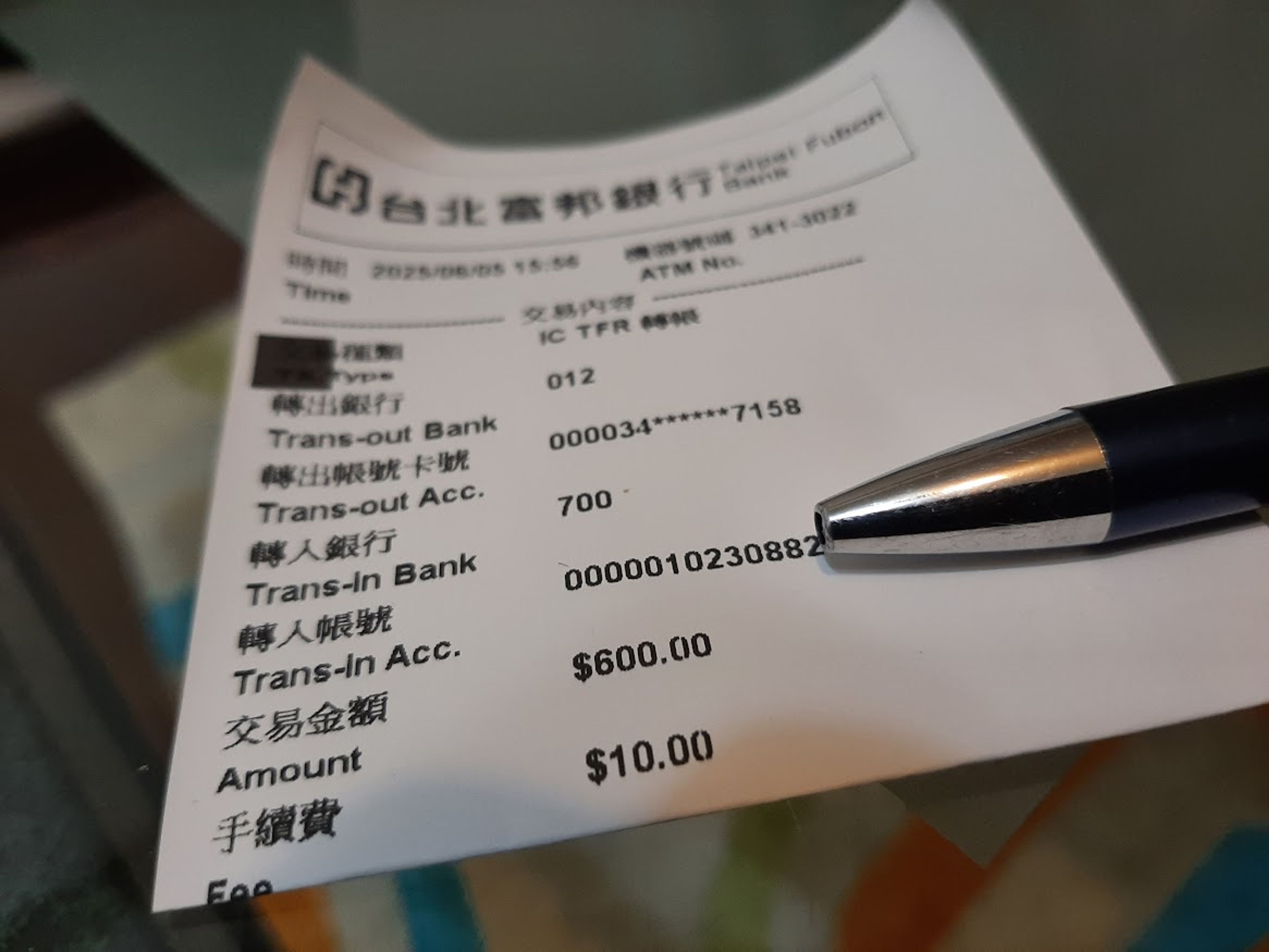 I transferred NT$600 (rounded up) on June 5, 2025. See screenshots of earnings report and transfer receipt.