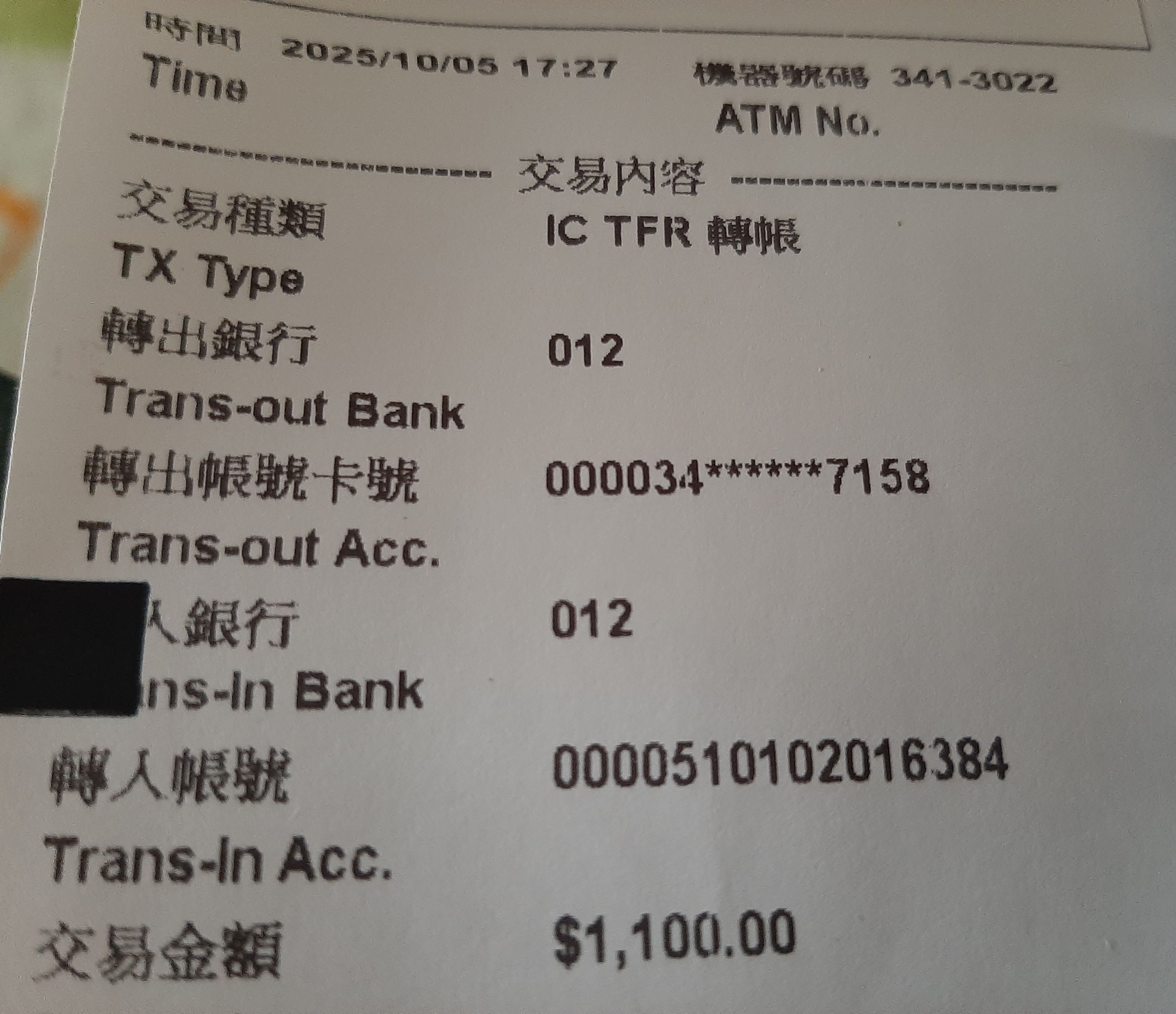 I transferred NT$1100 (rounded up) on October 5, 2025. See screenshots of earnings report and transfer receipt.